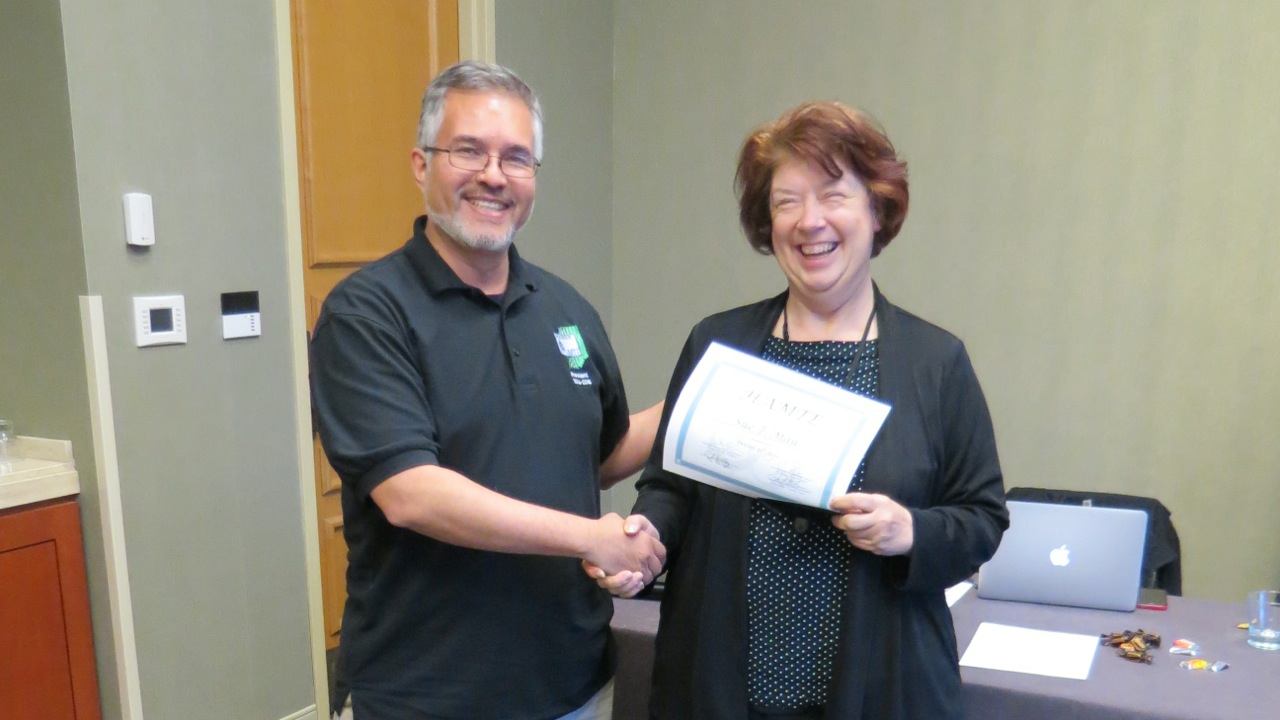 HAMTE President Enrique Galindo thanks outgoing HAMTE Treasurer Sue Mau for her service.