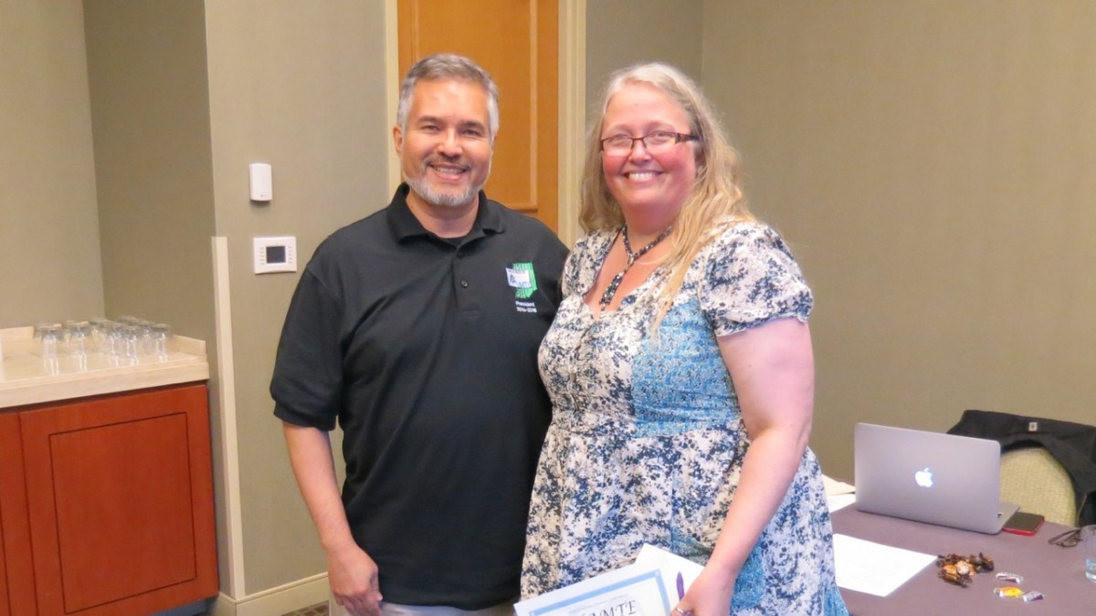 HAMTE President Enrique Galindo thanks outgoing chair of the Nominations and Elections Committee Liz Brown for her service.