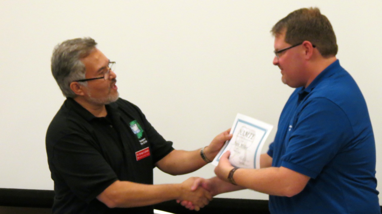 HAMTE President Enrique Galindo thanks outgoing Newsletter Editor Travis Miller for his service.
